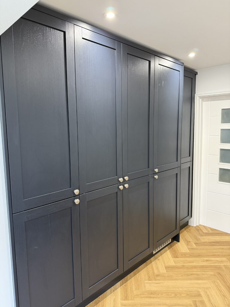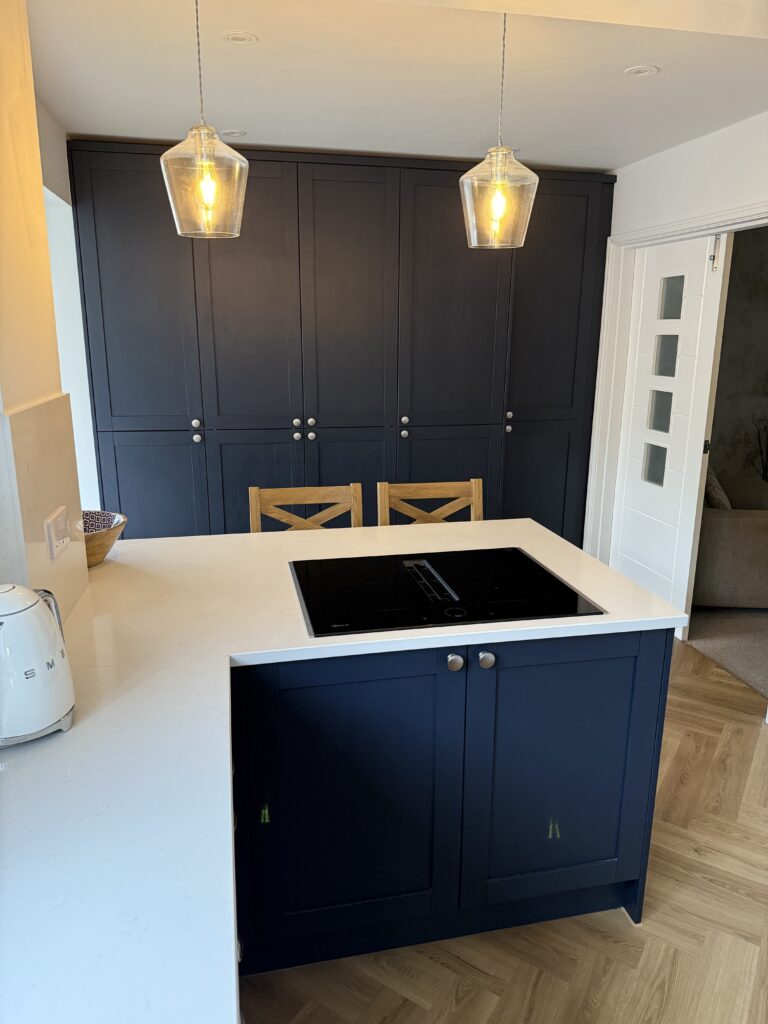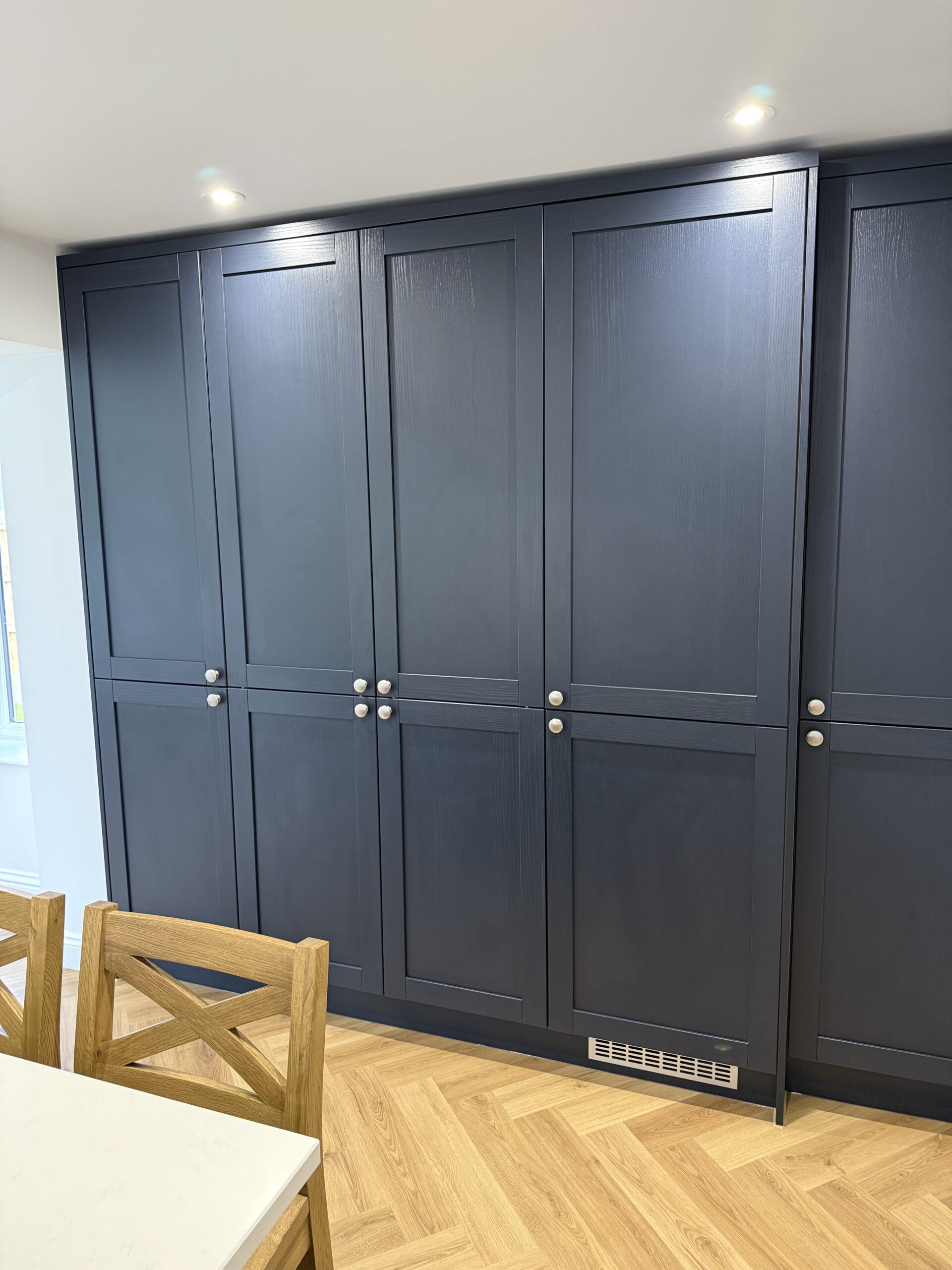 Here you see an example of our Sovereign Shaker Indigo Blue kitchen cabinetry with Silestone Miami Vena composite quartz worktops and wall cladding, including a bank of tall units housing a breakfast pantry, larder pull-out and fridge/freezer.