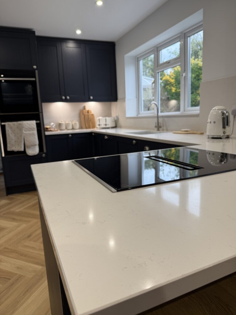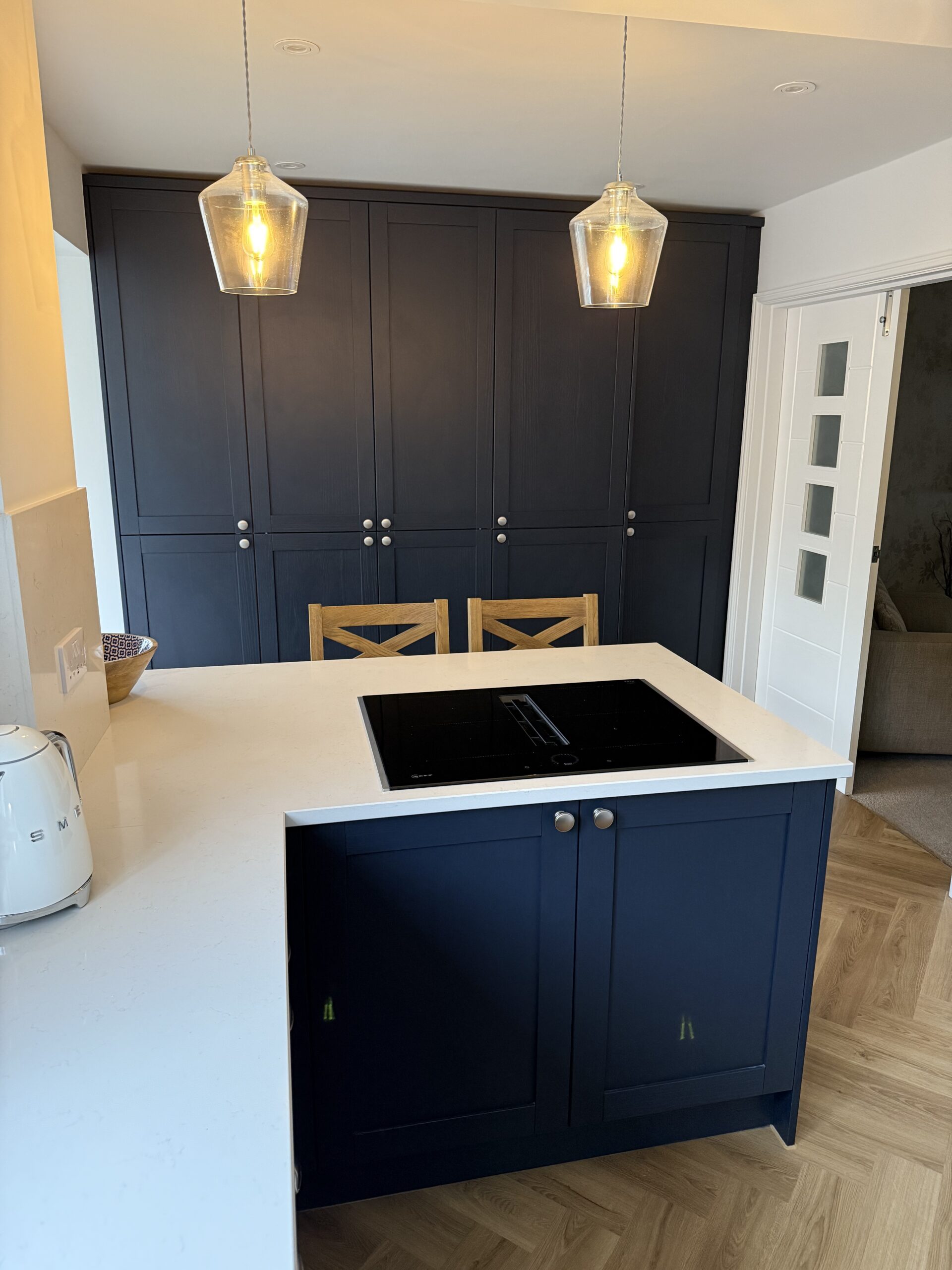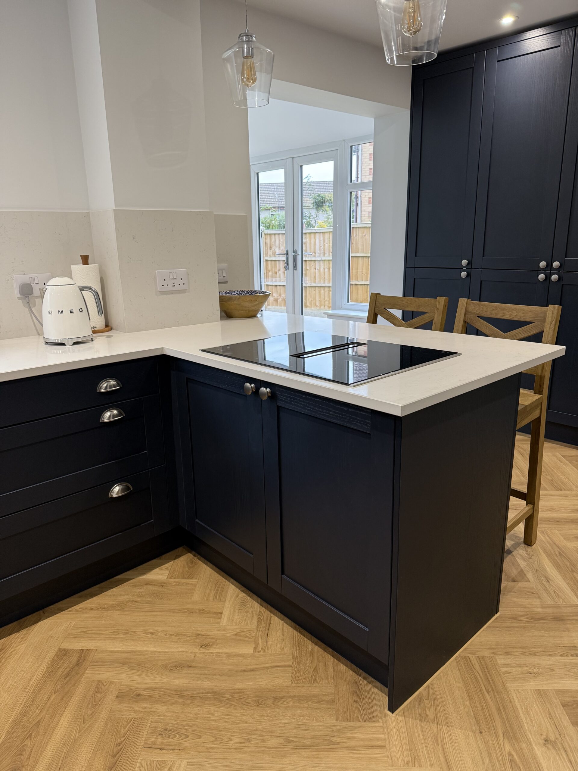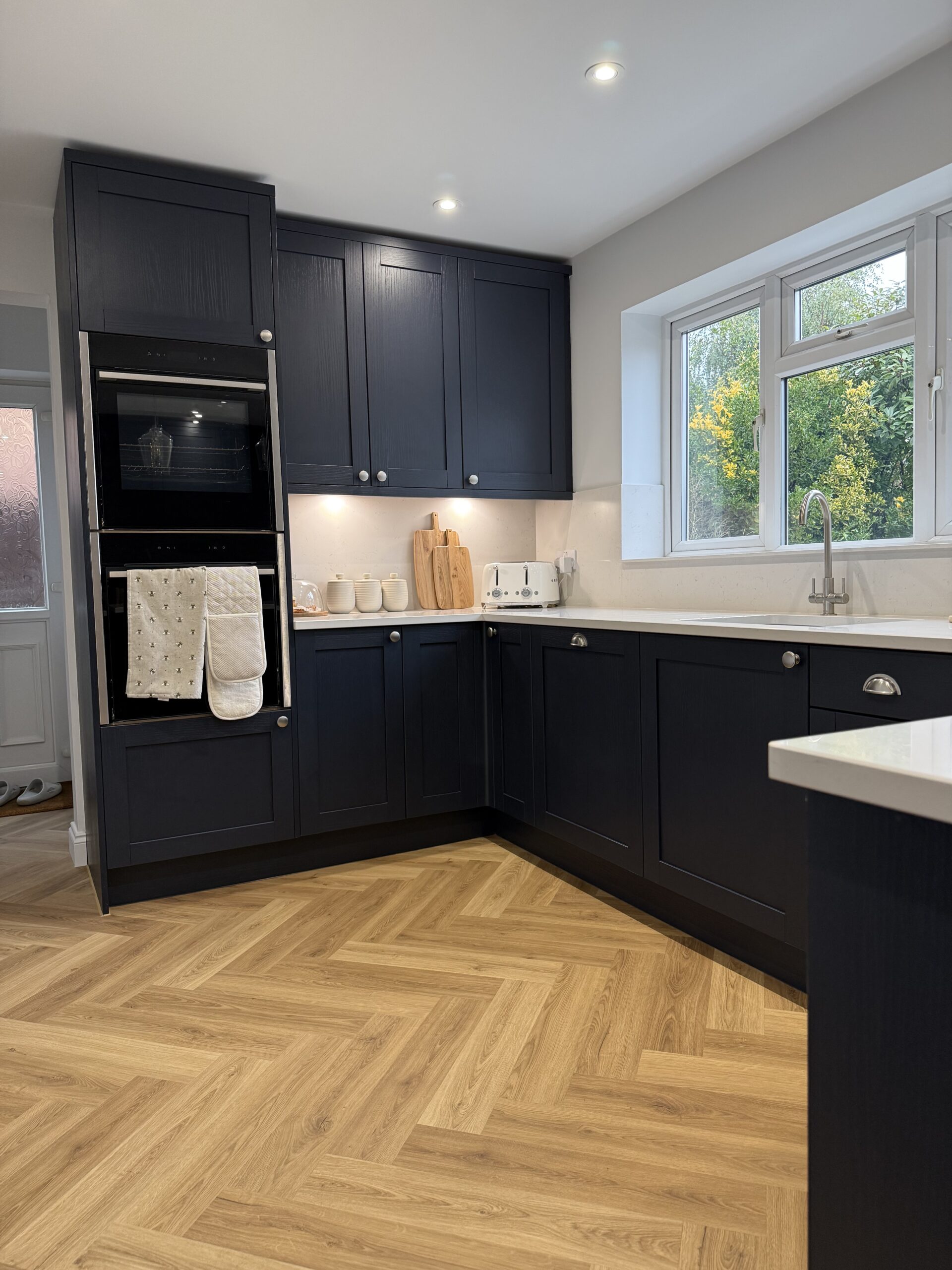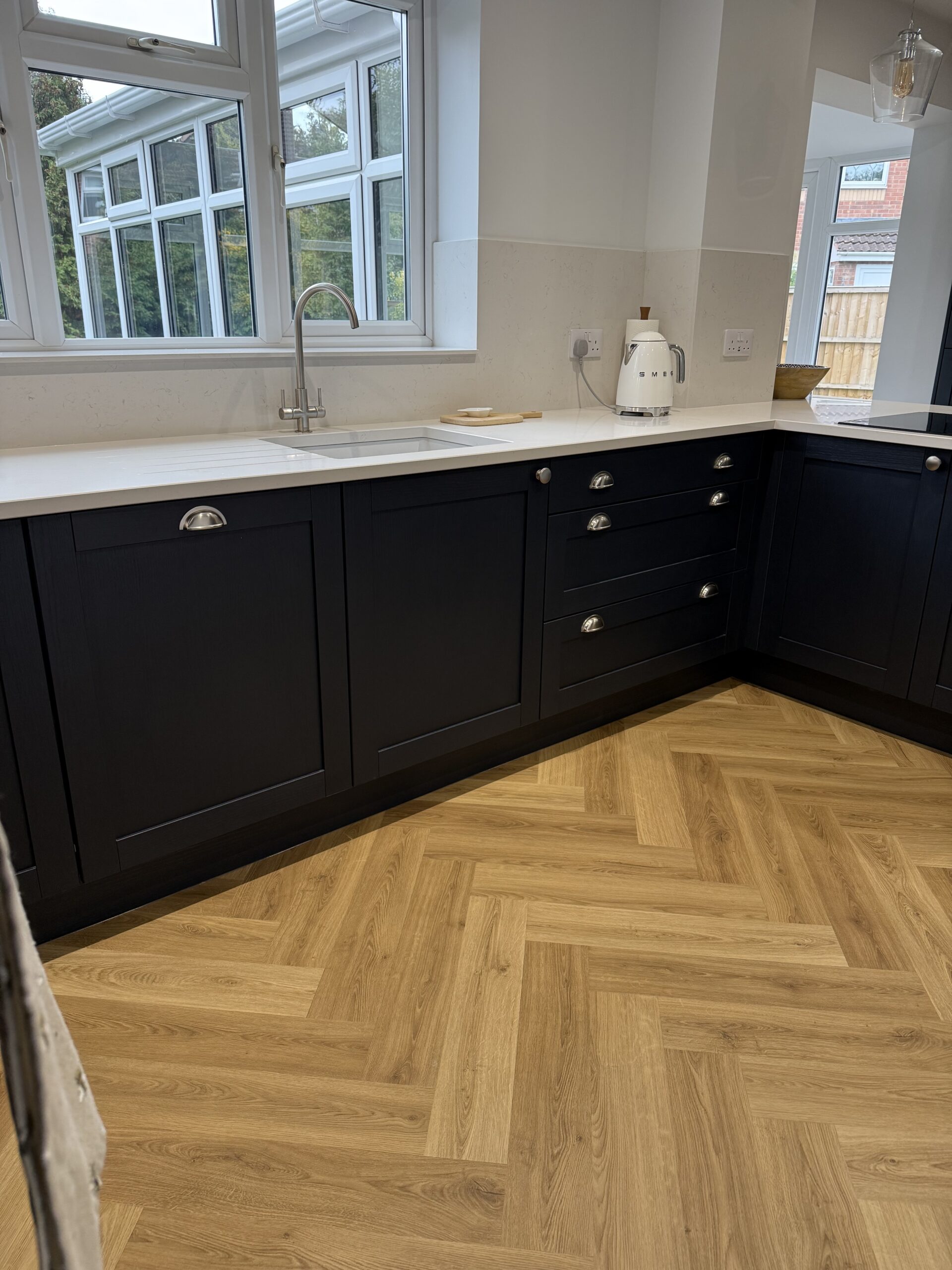 The customer arranged their own flooring, but we think the colour and the herringbone pattern work very well and add an element of warmth to the kitchen and go very well with the bum seats.