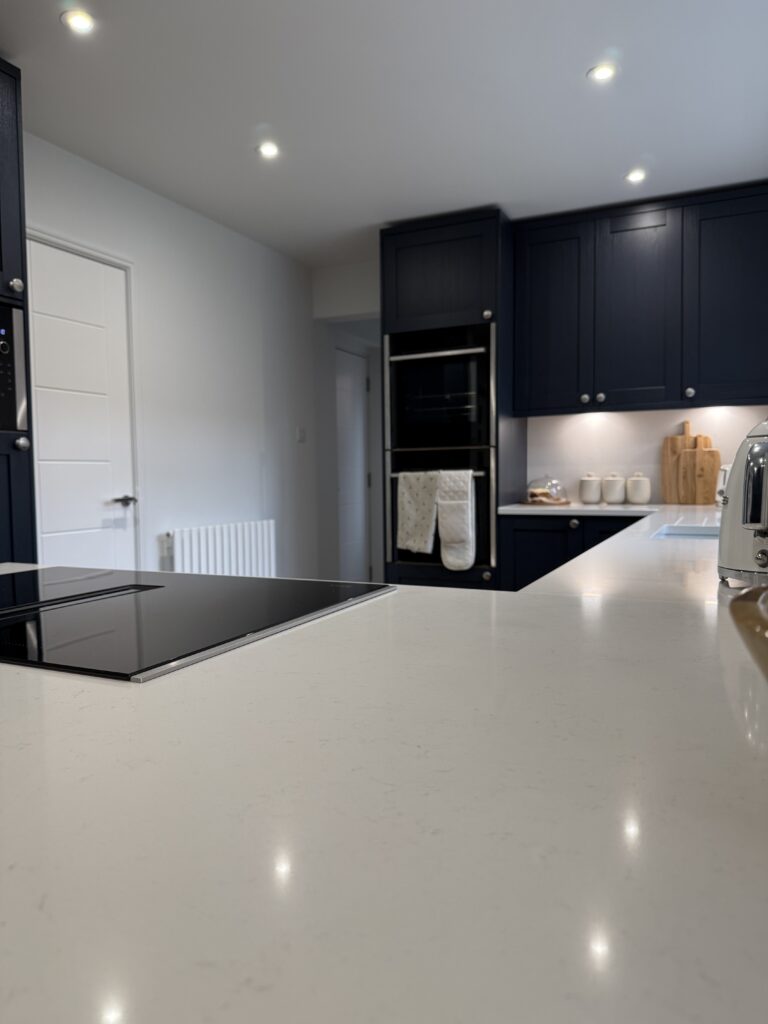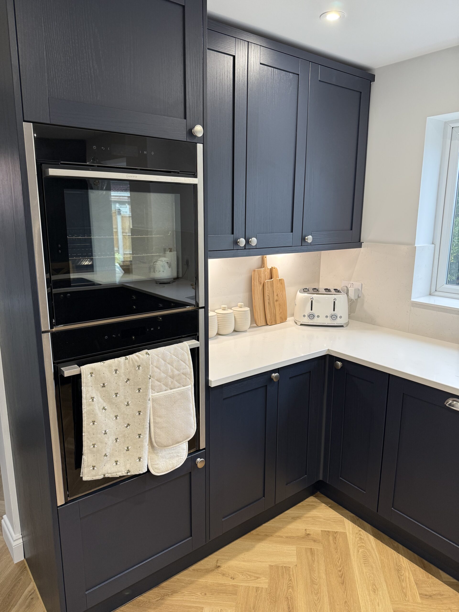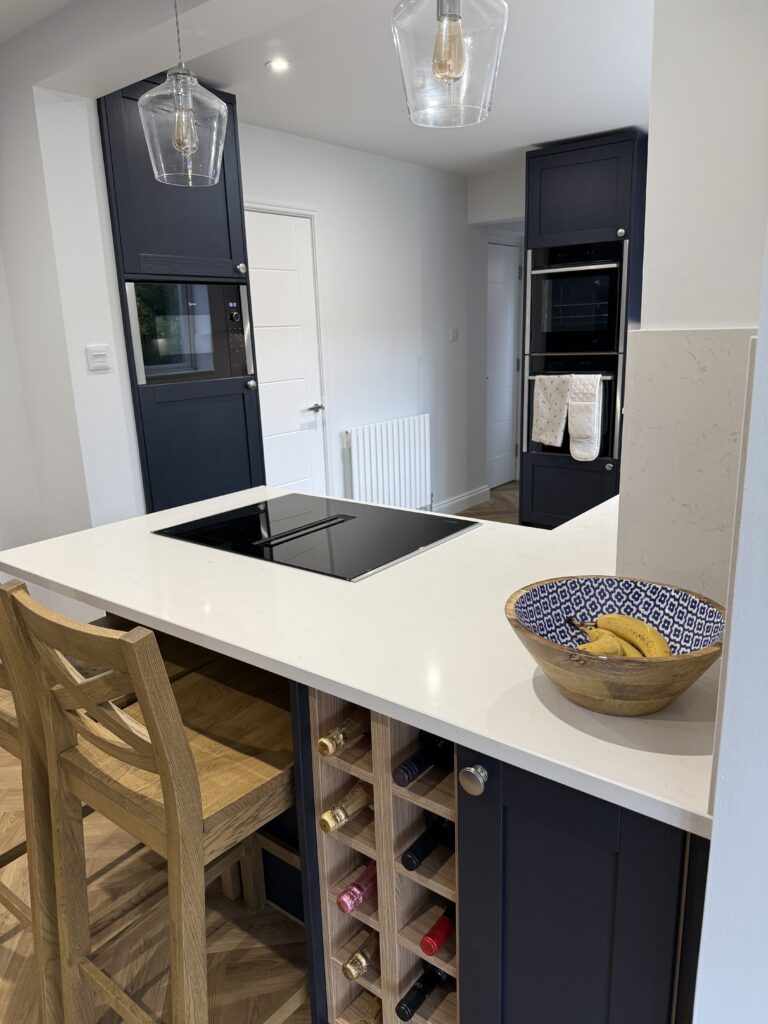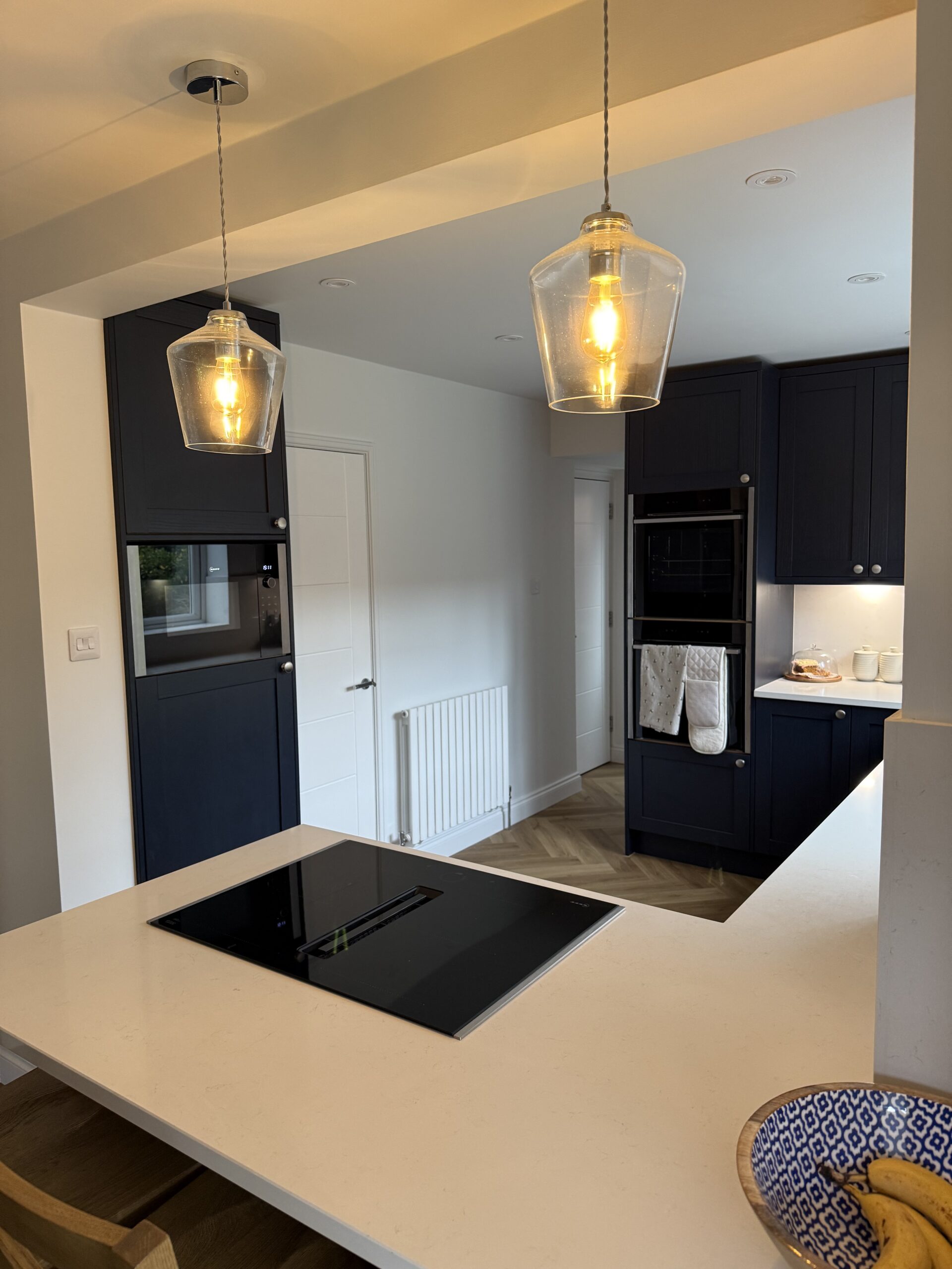 Elsewhere, there are two Neff Slide&Hide ovens stacked on top of each other to create generous cooking capacity (a must for the customer), a 70cm Neff venting hob which we managed to duct to outside thanks to the peninsula setup. This meant the customer didn’t have to have the peninsula area obstructed by a ceiling mounted cooker hood and allowed them to have pendant lighting instead. An integrated dishwasher, microwave and Franke granite undermount sink were also included.